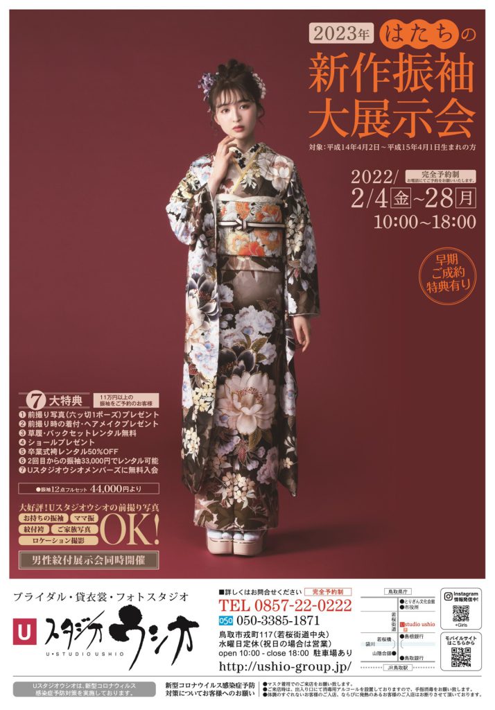2023年度、新成人の方向けの【新作振袖展示会】を開催いたします! . ご予約様優先とさせて頂きますので、ご予約してお越し下さいませ。(前日まで予約受付可能) . 対象:平成14年4月2日~平成15年4月1日生まれの方 振袖一式12点フルセット44,000円(税込)からご覧頂けます。 ご自前振袖で撮影のみご検討の方も、小物のみのレンタルで、今風にアレンジされたい方も その他ご要望も、ご対応可能! 是非お気軽にご相談くださいませ! ☎ 0857-22-0222