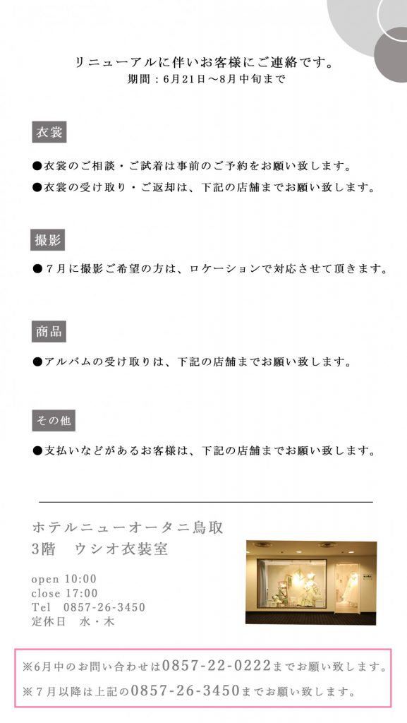 いつもU studio ushioをご愛顧いただきありがとうございます。 この度リニューアル工事のため下記の期間、本店を店休させていただきます。 ご不便をおかけいたしますが、何卒よろしくお願いいたします。 また、本店休業中はホテルニューオータニ鳥取ウシオ衣装室にて各種対応させていただきます。 撮影につきましては、出張撮影にて対応させていただきますので、ご相談ください。 期間:6月21日(月)〜8月中旬 6月中のお問い合わせは☎︎0857220222(U studio ushio本店) 7月以降のお問い合わせは☎︎0857263450(ホテルニューオータニ鳥取ウシオ衣装室) までよろしくお願い致します。